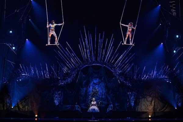 The Angels and the Bronx celebrate the start of a new era in the kingdom. Set 10 meters above the stage, trapezes become the aerial playground of daring flyers who perform incredible leaps to reach for the arms of mighty catchers suspended by their knees.