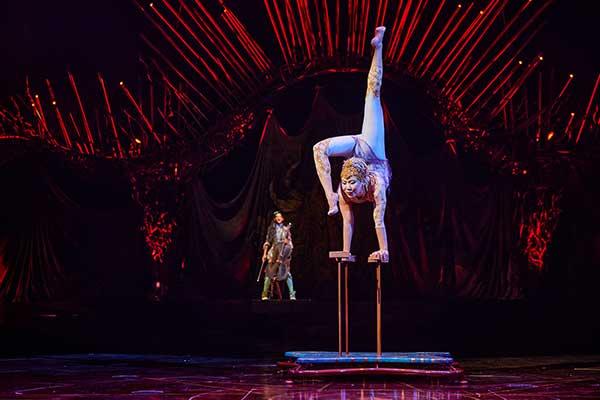 First appearance of the Bronx characters, the Cyr Wheel act represents the first manifestation that change is brewing at the heart of the kingdom. Exhibiting both strength and acrobatic poetry, a Bronx uses his own impetus to make a large, majestic hoop roll and spin across the stage.